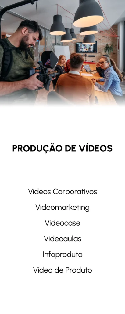 Quer aumentar a exposição de seus produtos e serviços na Internet? Produzimos vídeos sobre seu portfólio, com roteiro e estética alinhados à sua identidade visual e estratégia de mercado. Adicionalmente, produzimos fotografias publicitárias para uso em catálogos, anúncios, artes e embalagens.